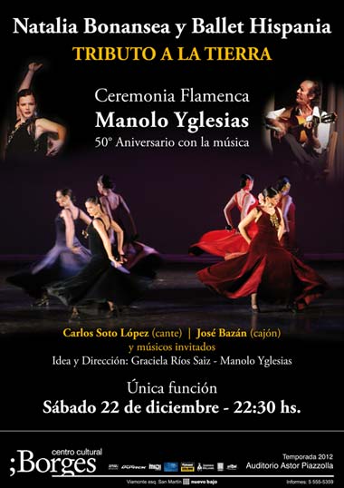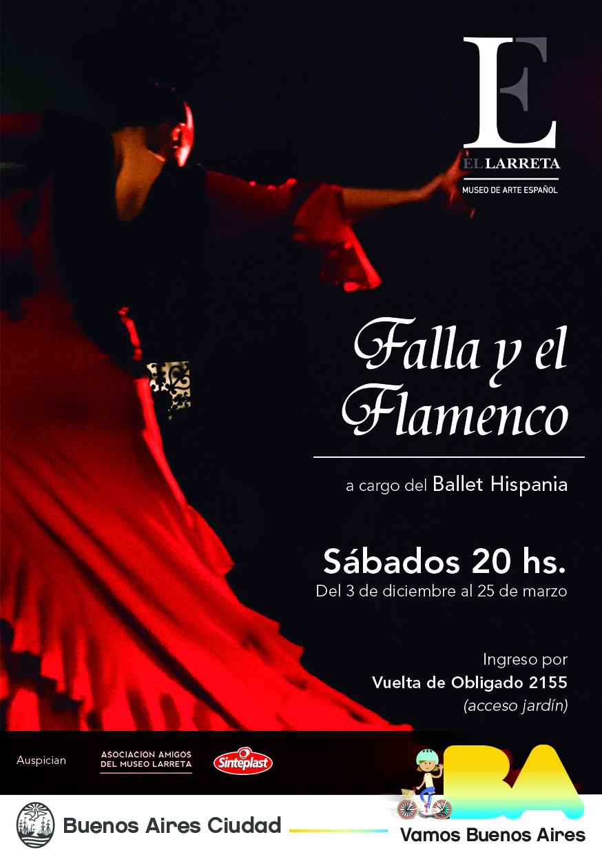 A la luz del flamenco / Idea y dirección: Graciela Ríos Saiz / Coreografía: Graciela Ríos Saiz y Natalia Bonansea Ríos / Intérpretes: Natalia Bonansea Ríos, Luciana Di Lorenzo y María Eugenia Seijó / Canto: Carlos Soto López / Guitarra: Agustín Hellín / Vestuario: Miguel Iglesias, Bibiana Muñoz y Yolanda Moreira / Técnico y operador de luces y sonido: Emilio Bonansea / Duración: 65 minutos / En el Museo de Arte Español Enrique Larreta, Juramento 2291 / Funciones: los sábados, a las 20.30